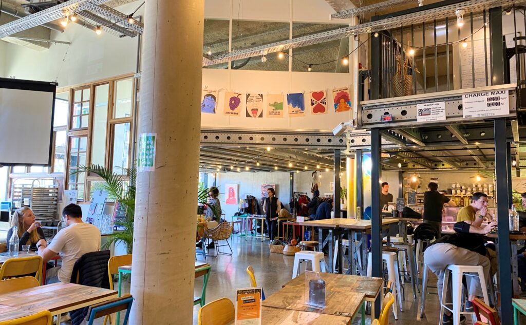 Dès l’arrivée dans cet espace, on se sent immédiatement bien. Friperie en place ce jour là, décor style récup barres apparentes au plafond, ambiance de grand hangar décoré, café / bar à vin, plusieurs espaces de restauration et une grande terrasse extérieure.